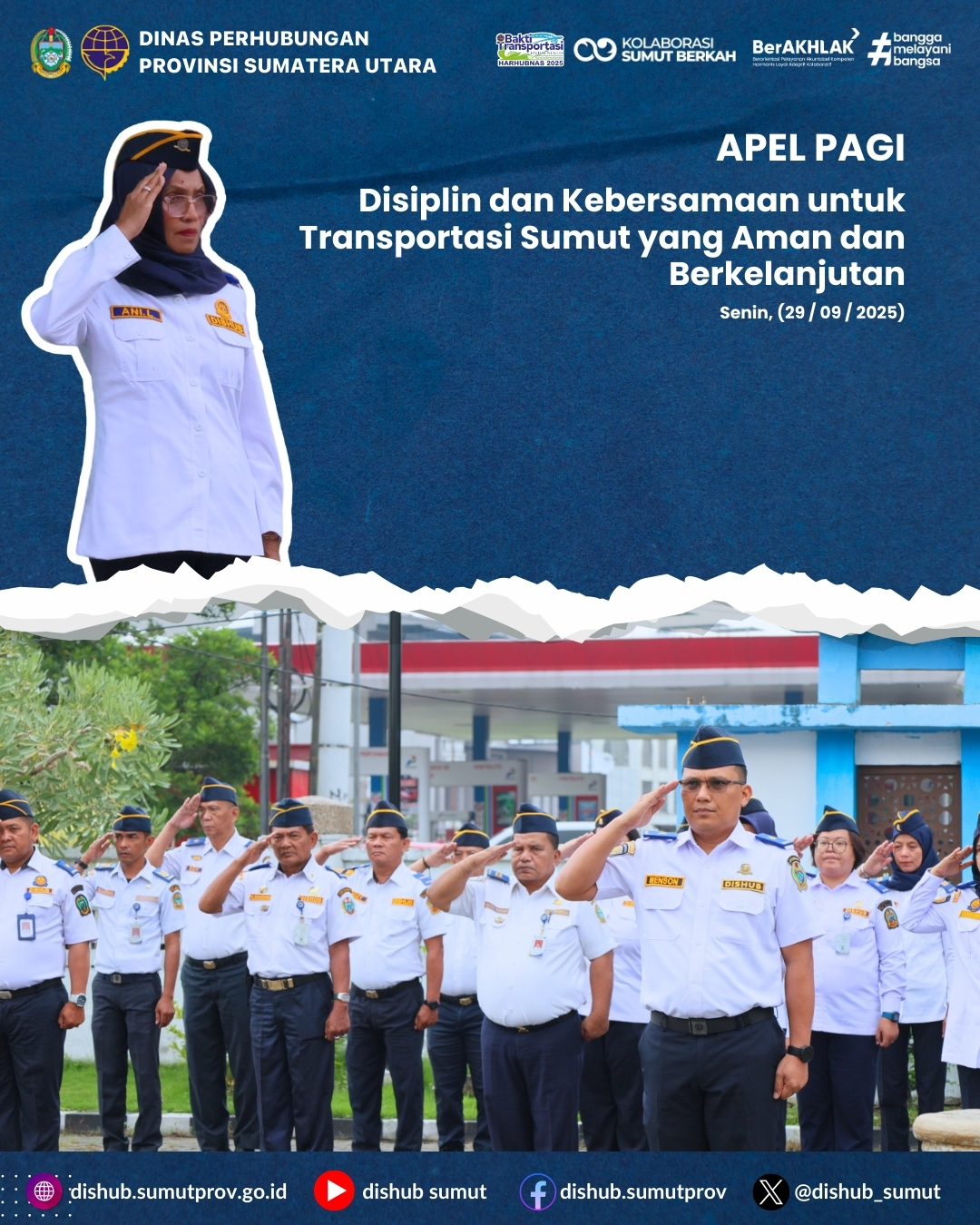 Medan โ€“ Dinas Perhubungan Provinsi Sumatera Utara melaksanakan Apel Pagi bersama seluruh ASN dan Non-ASN, di halaman Kantor Dishub Sumut. Sekretaris Dinas Perhubungan Provinsi Sumatera Utara Rochani Litiloly, ST, MT, bertindak sebagai Pembina Apel dan Pemimpin Apel Kepala Seksi Manajemen Lalu Lintas Menson Septo Putranta, SE.