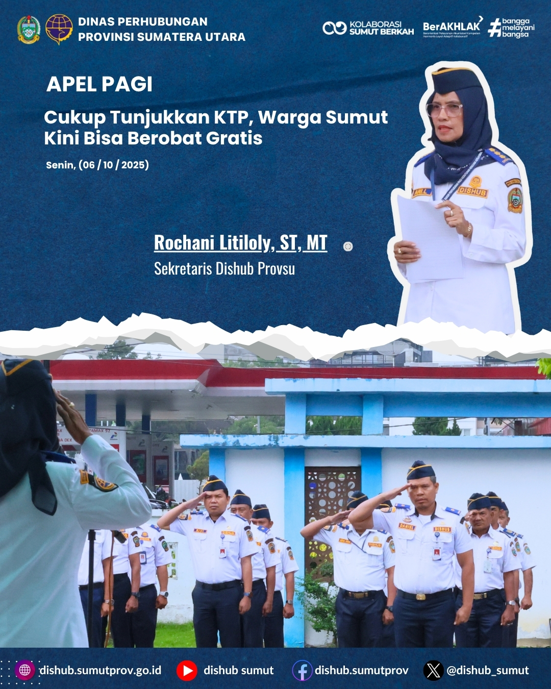 Medan – Apel pagi di lingkungan Dinas Perhubungan Provinsi Sumatera Utara, Senin (6/10/2025), berlangsung penuh semangat. Dalam apel tersebut, Sekretaris Dishub Sumut Rochani Litiloly membacakan arahan Gubernur Sumatera Utara, Bobby Nasution, yang berisi pesan penting terkait keberhasilan besar di bidang layanan kesehatan.