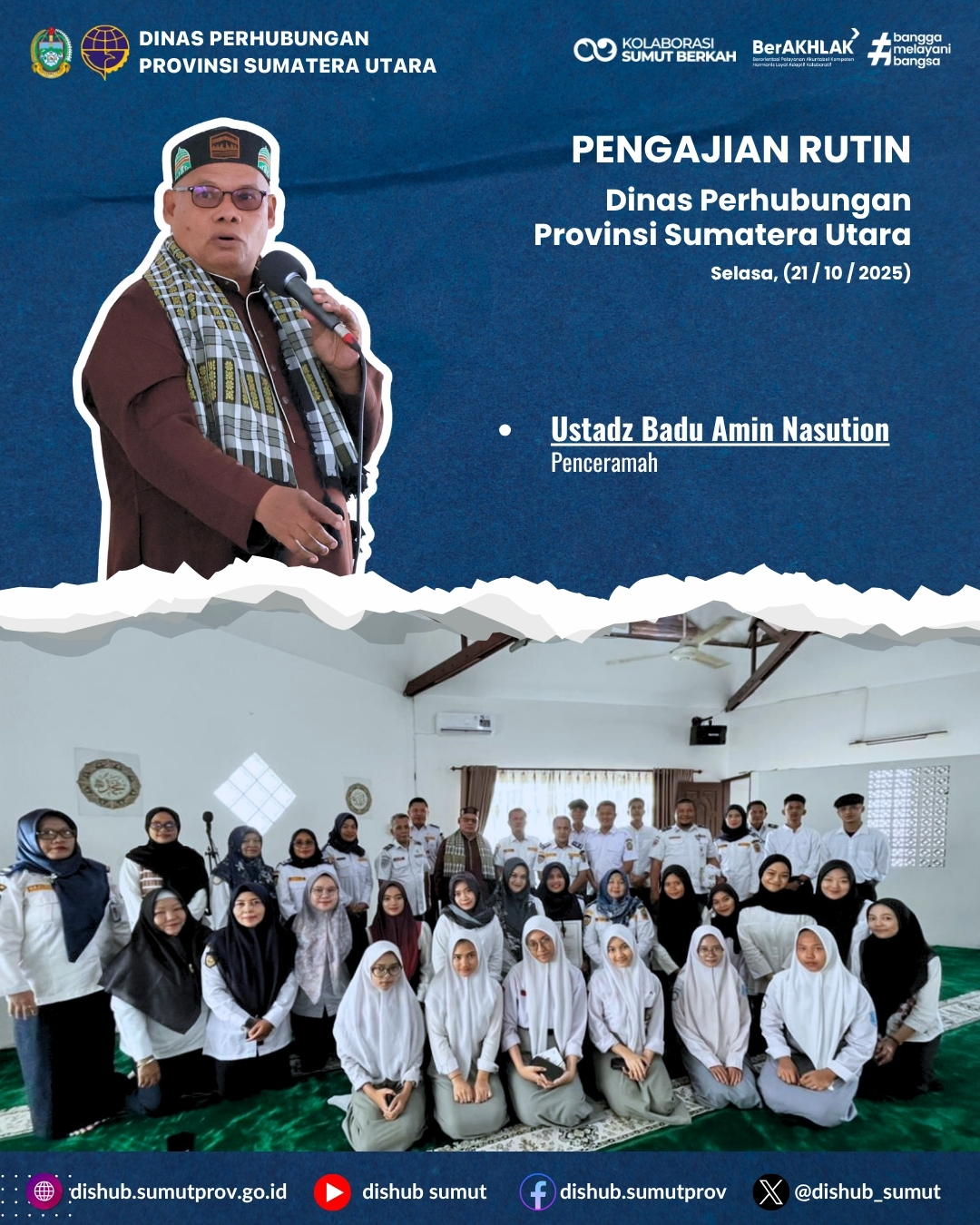Medan – Kegiatan Keagamaan Rutin Pengajian Bersama dengan “Ustadz Ahmad Yani”, yang diikuti bersama Seluruh ASN dan Non-ASN, bertempat di Lt. II Musholla Kantor Dishub Provsu.