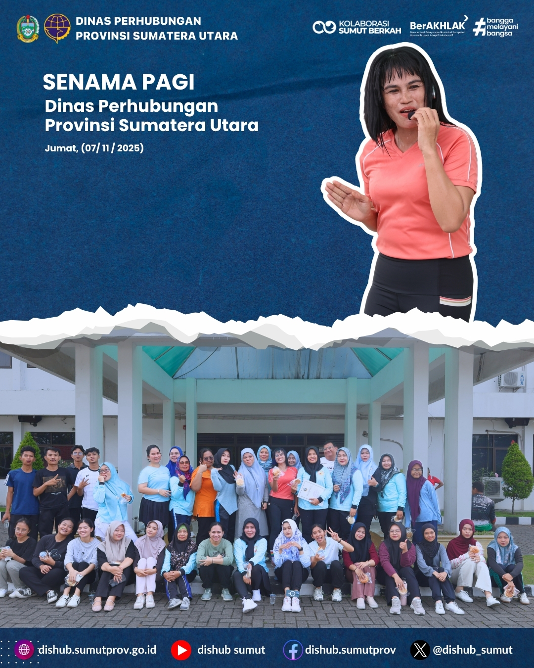 Medan – Dinas Perhubungan Provinsi Sumatera Utara melaksanakan Kegiatan Rutin setiap hari Jum’at “Senam Pagi” Bersama Seluruh Aparatur Sipil Negara, Non-ASN, Dharma Wanita Persatuan Dinas Perhubungan Provinsi Sumatera Utara dan Badan Keuangan Aset Daerah Provinsi Sumatera Utara, bertempat di Halaman Kantor Dinas Perhubungan Provinsi Sumatera Utara. Jum’at, (7/11/2025).