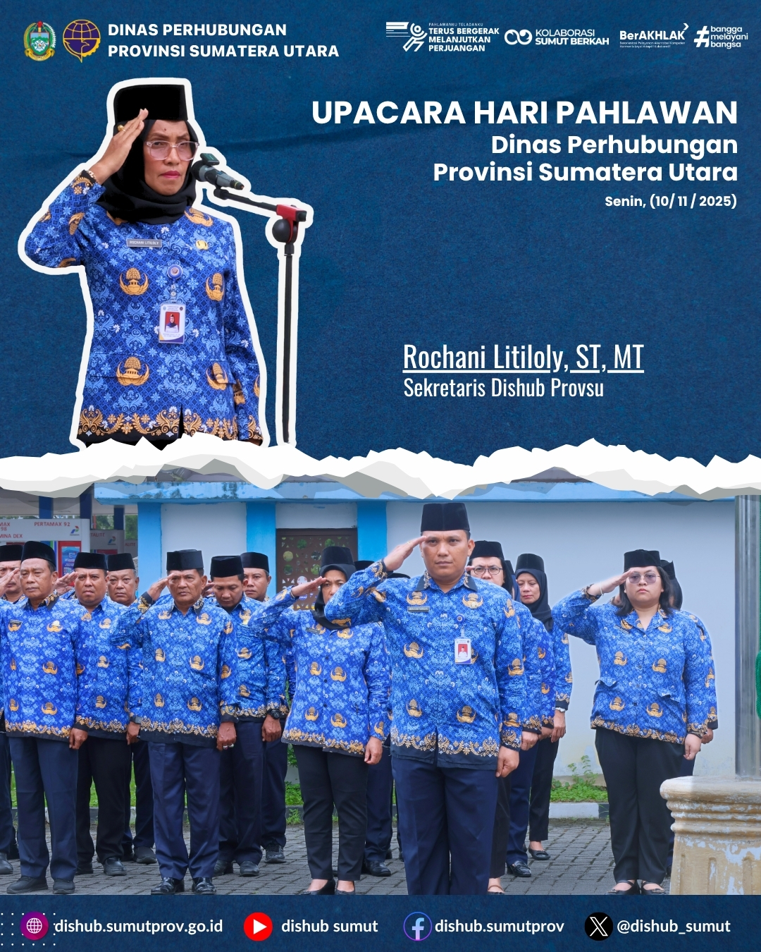 Mengikuti Upacara Bendera Hari Pahlawan Tahun 2025. Sekdishub sebagai Pembina Apel dan Pemimpin Apel Pagi Kepala Seksi MLL Bidang Lalu Lintas Jalan Sdr. Menson Septo Putranta. Kegiatan Upacara Bendera Hari Pahlawan Tahun 2025 diikuti seluruh ASN dan Non-ASN dilingkungan Dishub Provsu dan BKAD Provsu, bertempat di Halaman Kantor Dishub Provsu. Senin, (10/11/2025).