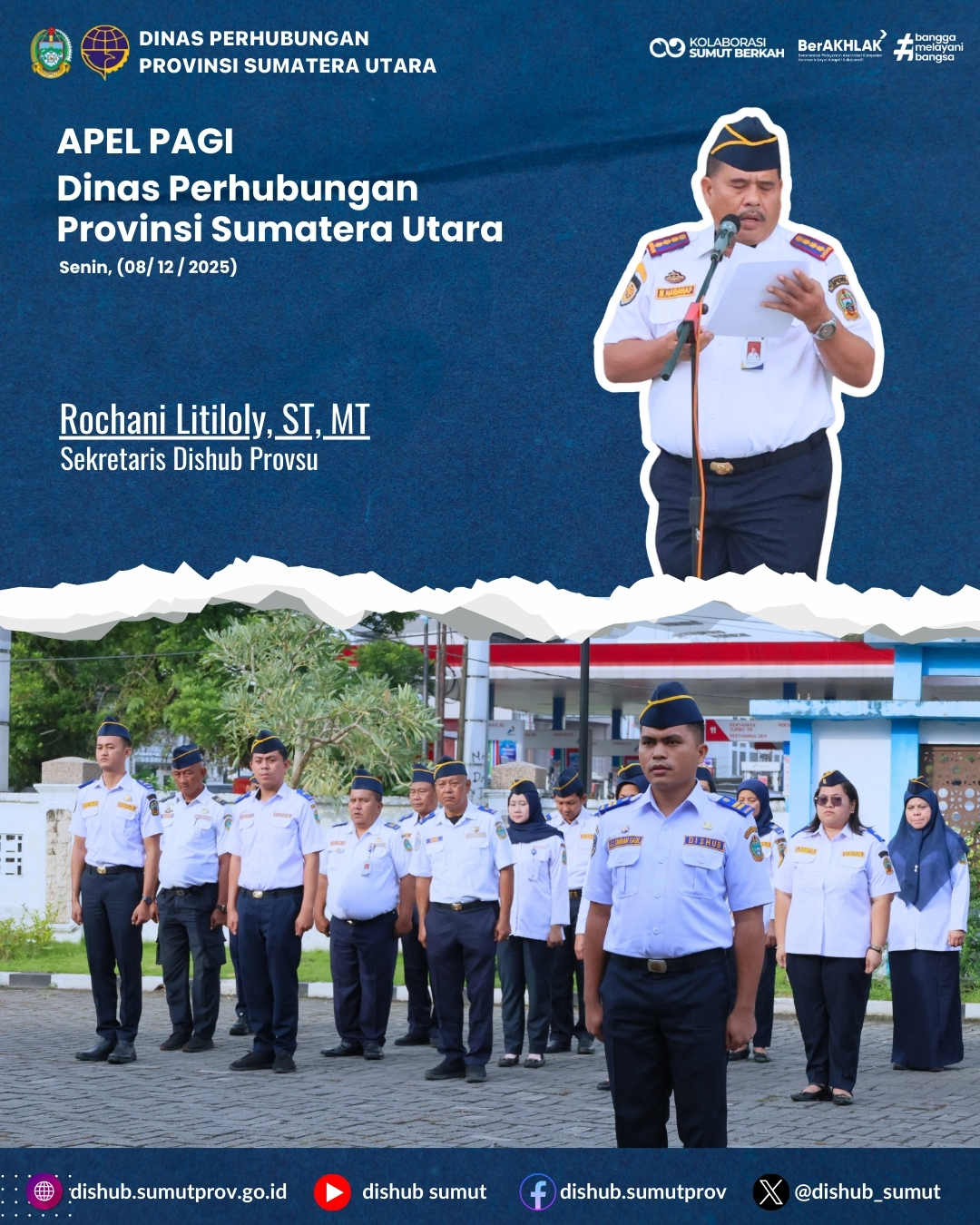 Medan – Dinas Perhubungan Provinsi Sumatera Utara melaksanakan Apel Pagi bersama seluruh ASN dan Non-ASN, di halaman Kantor Dishub Sumut. Sekretaris Dinas Perhubungan Provinsi Sumatera Utara Rochani Litiloly, ST, MT, bertindak sebagai Pembina Apel dan Kepala Seksi Kepelabuhanan Bidang Pelayaran Joel Dion Cius Lumban Gaol, S.STP, sebagai Pemimpin Apel. Senin, (08/12/2025).