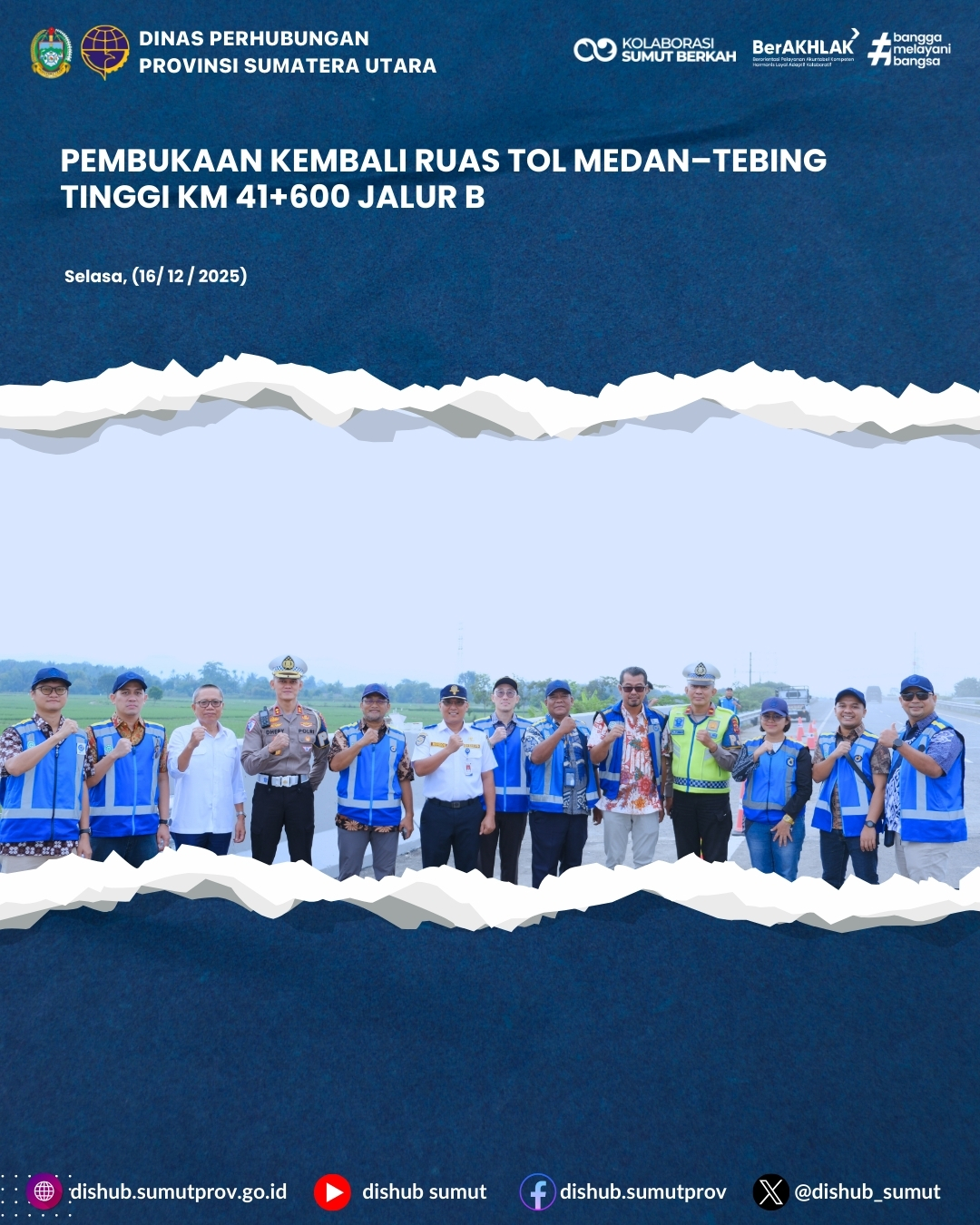 Ruas Jalan Tol Medan–Tebing Tinggi KM 41+600 Jalur B, arah Tebing Tinggi menuju Medan, resmi dibuka kembali untuk lalu lintas (open traffic) setelah sebelumnya dilakukan penanganan dan evaluasi kondisi jalan. Pembukaan ini dilaksanakan guna memulihkan kelancaran arus kendaraan serta memberikan kenyamanan dan keselamatan bagi para pengguna jalan tol.