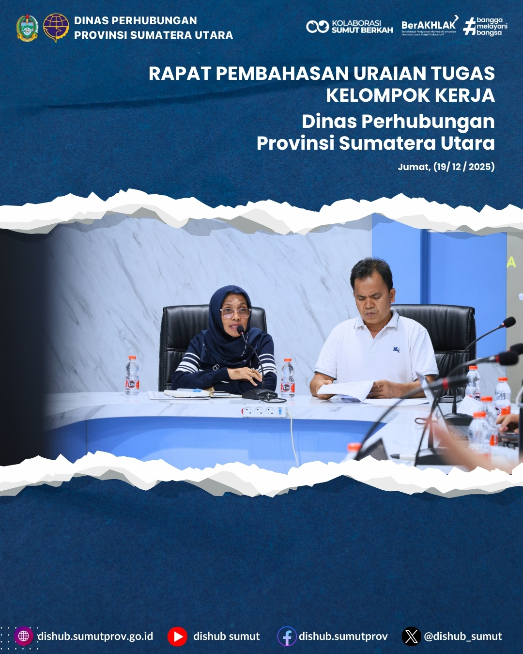 Jumat (19/12/2025), Dinas Perhubungan Provinsi Sumatera Utara menggelar rapat pembahasan uraian tugas Kelompok Kerja Persiapan dan Percepatan Pengelolaan Transportasi Perkotaan Sistem Bus Rapid Transit (BRT) di Command Center Room Dishub Sumut. Rapat ini menjadi langkah awal menyatukan peran, tanggung jawab, dan komitmen lintas bidang agar program BRT kelak berjalan tepat sasaran.
