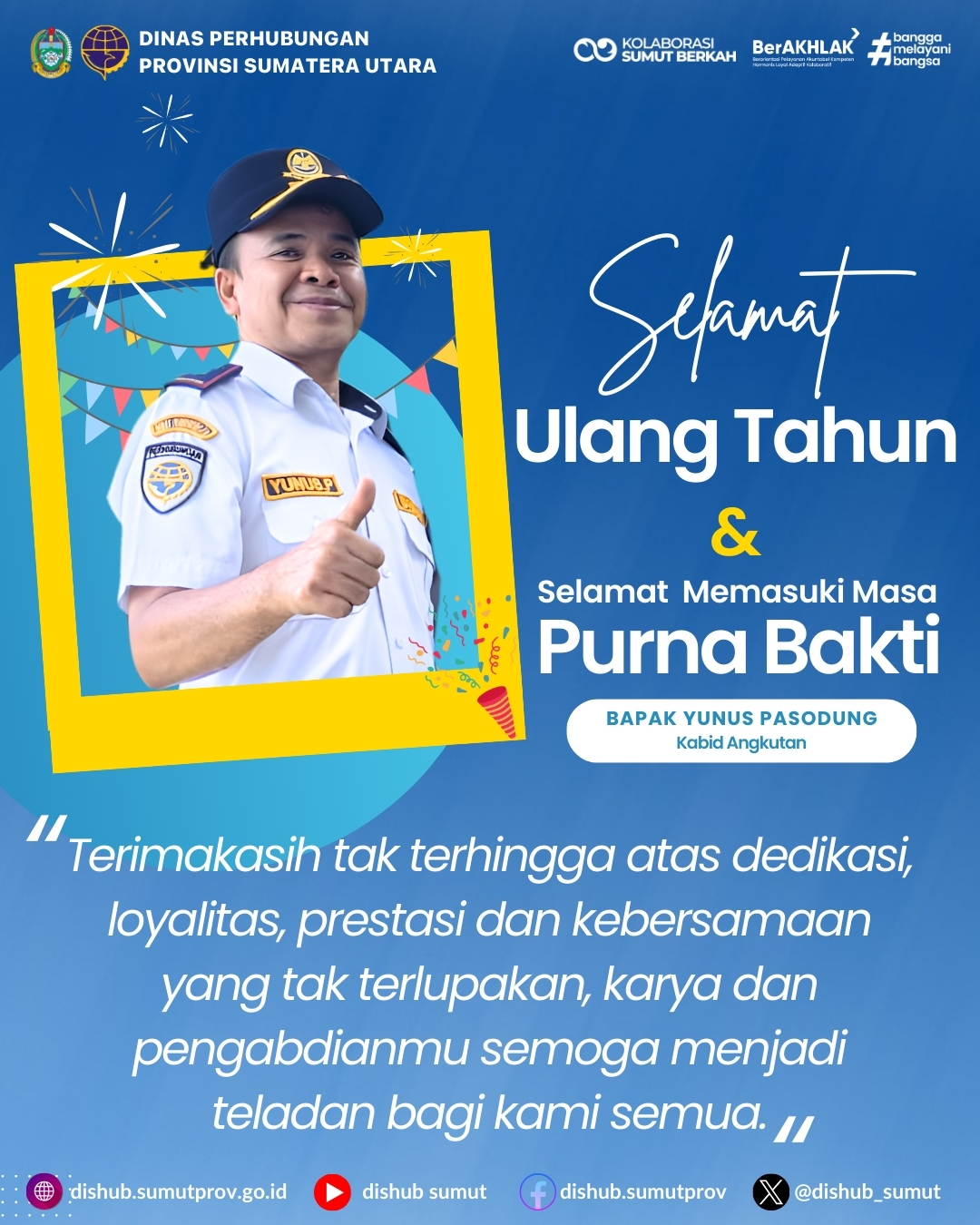 Perayaan ulang tahun yang dirangkaikan dalam acara ini semakin menambah makna kebersamaan, menjadi ungkapan rasa syukur atas kesehatan, usia, dan perjalanan pengabdian yang telah dilalui. Ucapan selamat, doa, dan harapan disampaikan oleh keluarga besar Dinas Perhubungan Provinsi Sumatera Utara agar Bapak Yunus Pasodung, ST senantiasa diberikan kesehatan, kebahagiaan, serta keberkahan dalam menjalani masa purnabakti.