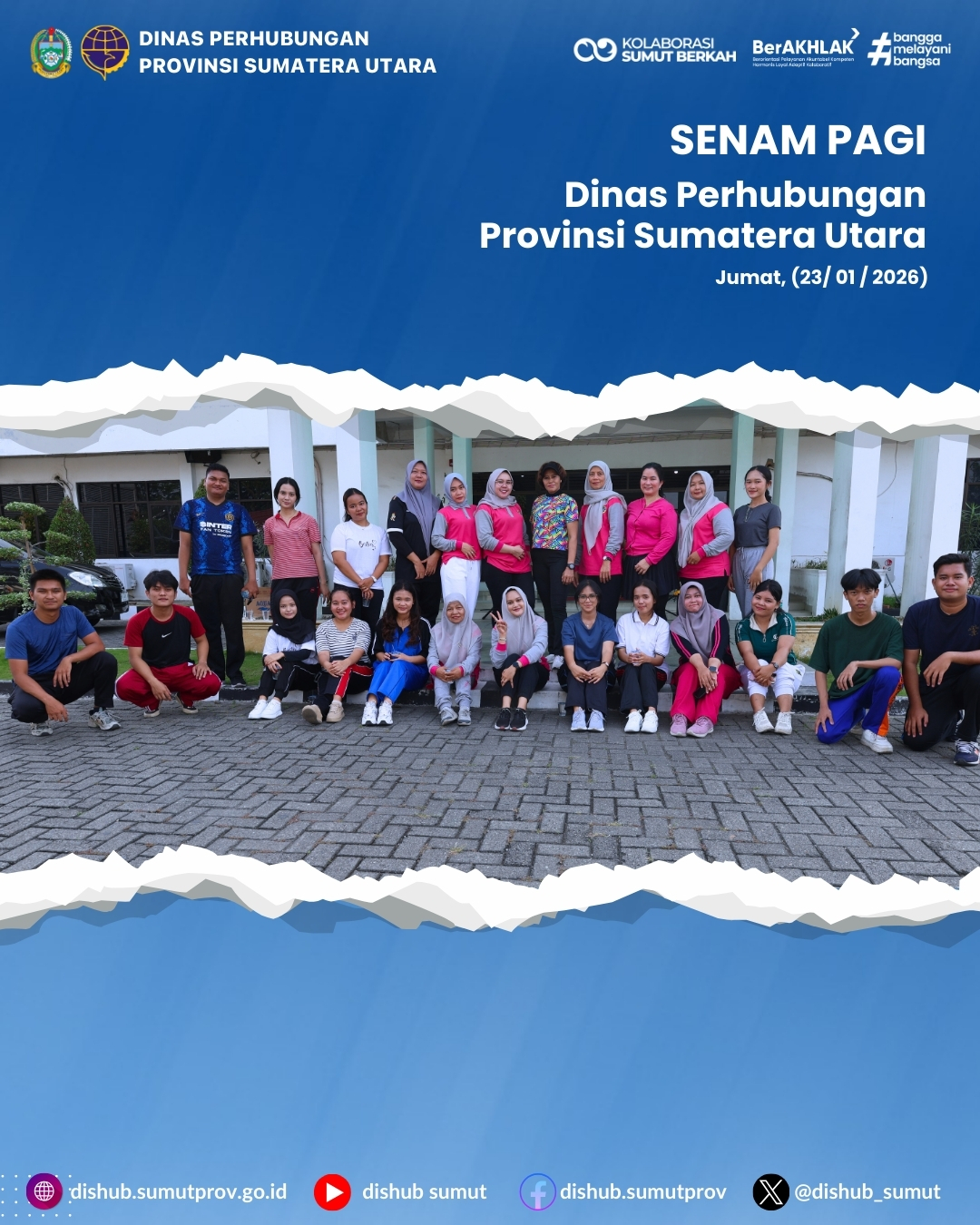Melalui kegiatan senam pagi ini diharapkan dapat tercipta lingkungan kerja yang sehat, produktif, dan harmonis, sekaligus menjadi sarana untuk menumbuhkan kesadaran akan pentingnya menjaga kesehatan di tengah kesibukan tugas dan tanggung jawab sehari-hari. Jum’at, (23/01/2026). #InfoDishubSumut #KolaborasiSumutBerkah #SalamKolaborasi #SumutBerkah