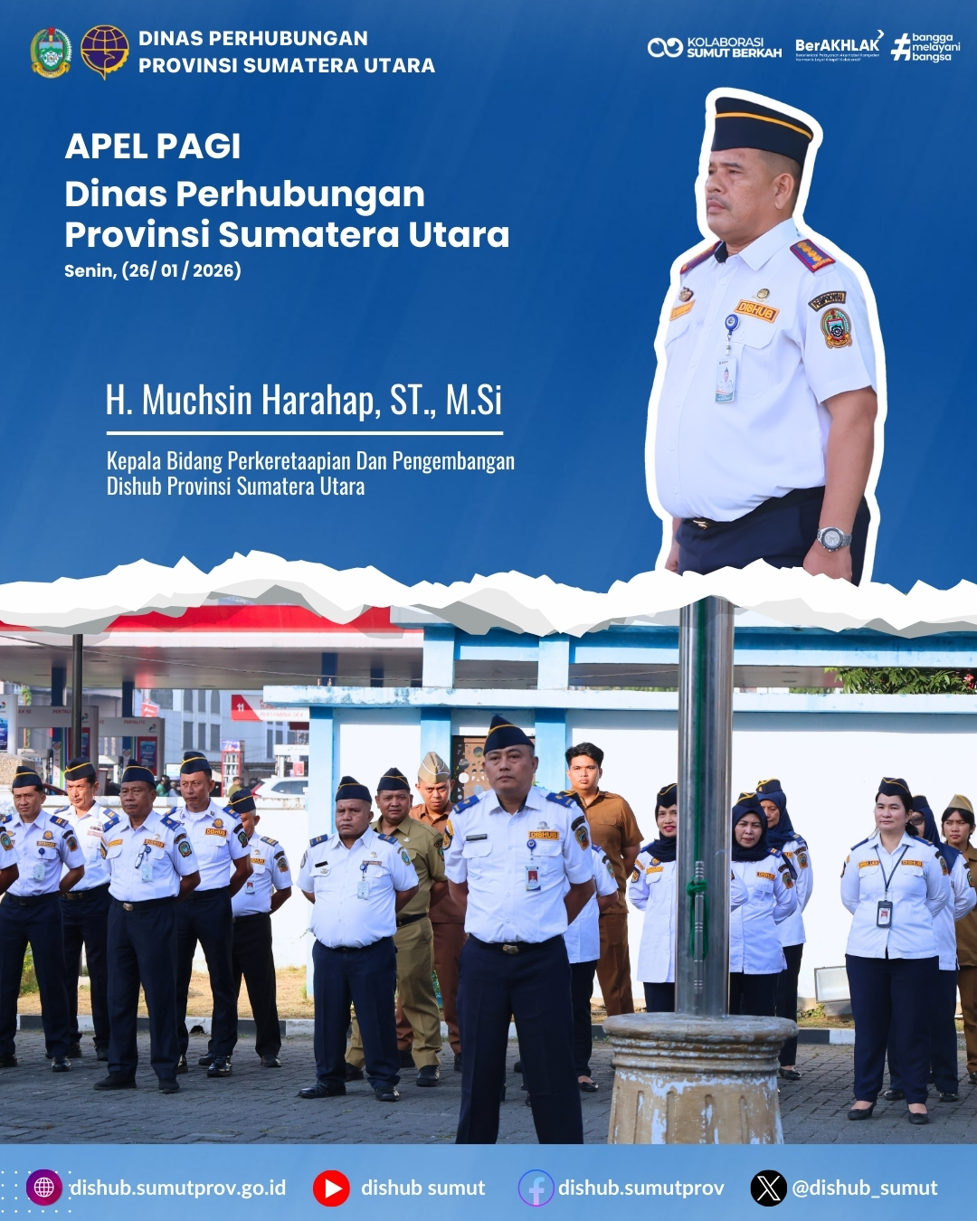 Melalui pelaksanaan Apel Pagi ini, diharapkan tercipta semangat kerja yang lebih baik serta peningkatan kinerja aparatur dalam mendukung program dan kebijakan Dinas Perhubungan Provinsi Sumatera Utara. Senin, (26/01/2026). #InfoDishubSumut #KolaborasiSumutBerkah #SalamKolaborasi #SumutBerkah