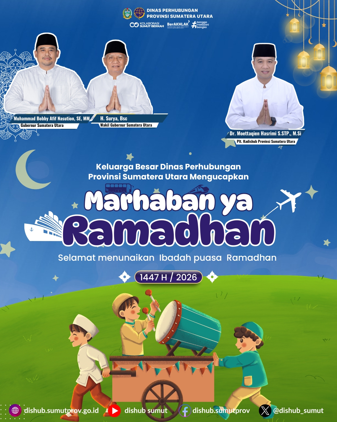 Keluarga Besar Dinas Perhubungan Provinsi Sumatera Utara mengucapkan Selamat Menunaikan Ibadah Puasa Ramadhan 1447 Hijriah kepada seluruh umat Muslim, khususnya masyarakat Provinsi Sumatera Utara.