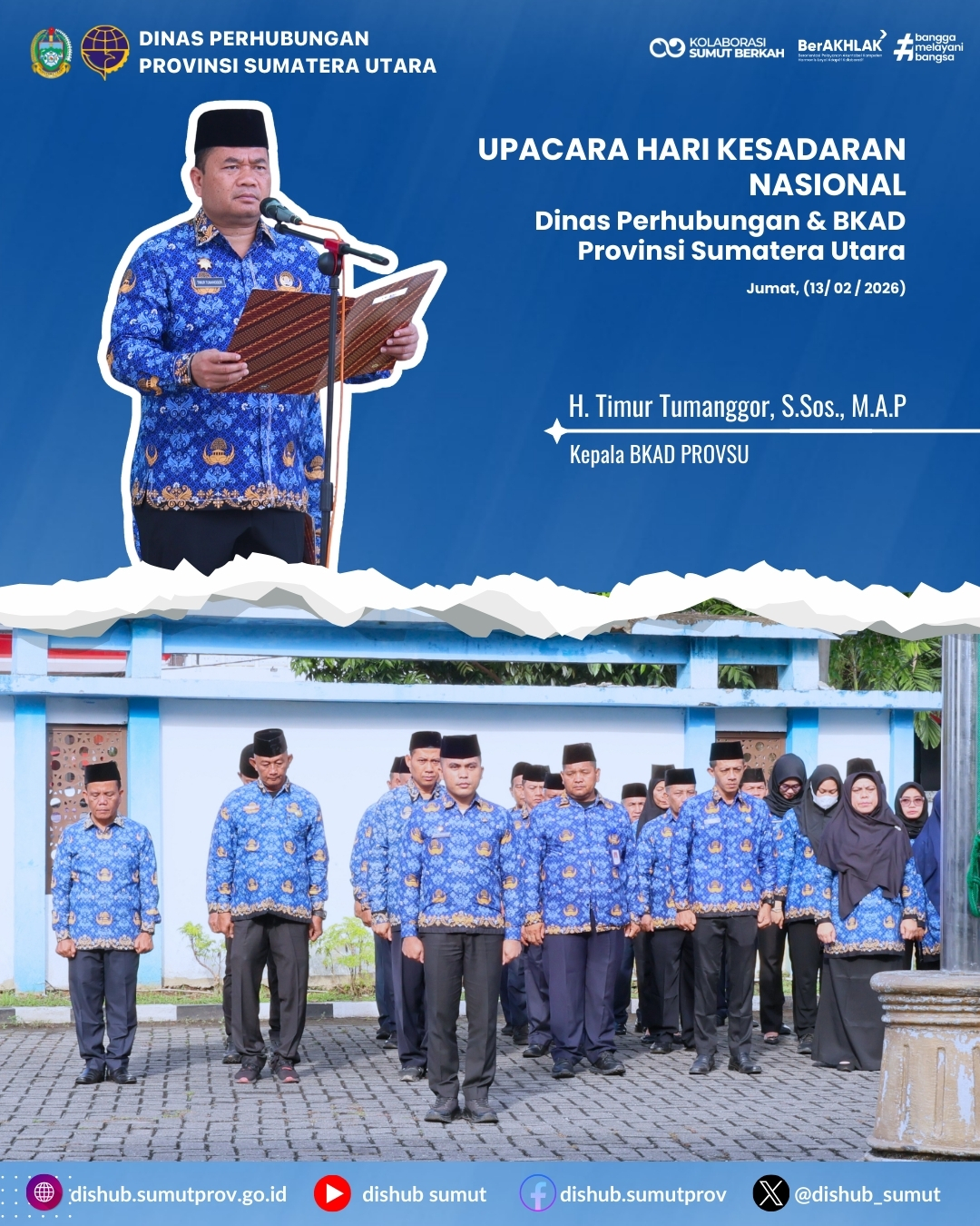 Dalam rangka memperingati Hari Kesadaran Nasional, jajaran aparatur sipil negara di lingkungan Dinas Perhubungan Provinsi Sumatera Utara bersama Badan Keuangan dan Aset Daerah Provinsi Sumatera Utara melaksanakan Upacara Bendera pada hari Selasa, 17 Februari 2026, dengan penuh khidmat dan tertib.