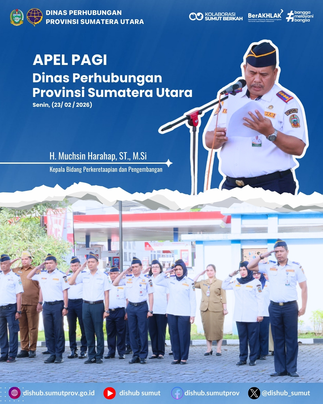 Dinas Perhubungan Provinsi Sumatera Utara melaksanakan Apel Pagi yang berlangsung dengan tertib dan khidmat di lingkungan kantor Dinas Perhubungan Provinsi Sumatera Utara.